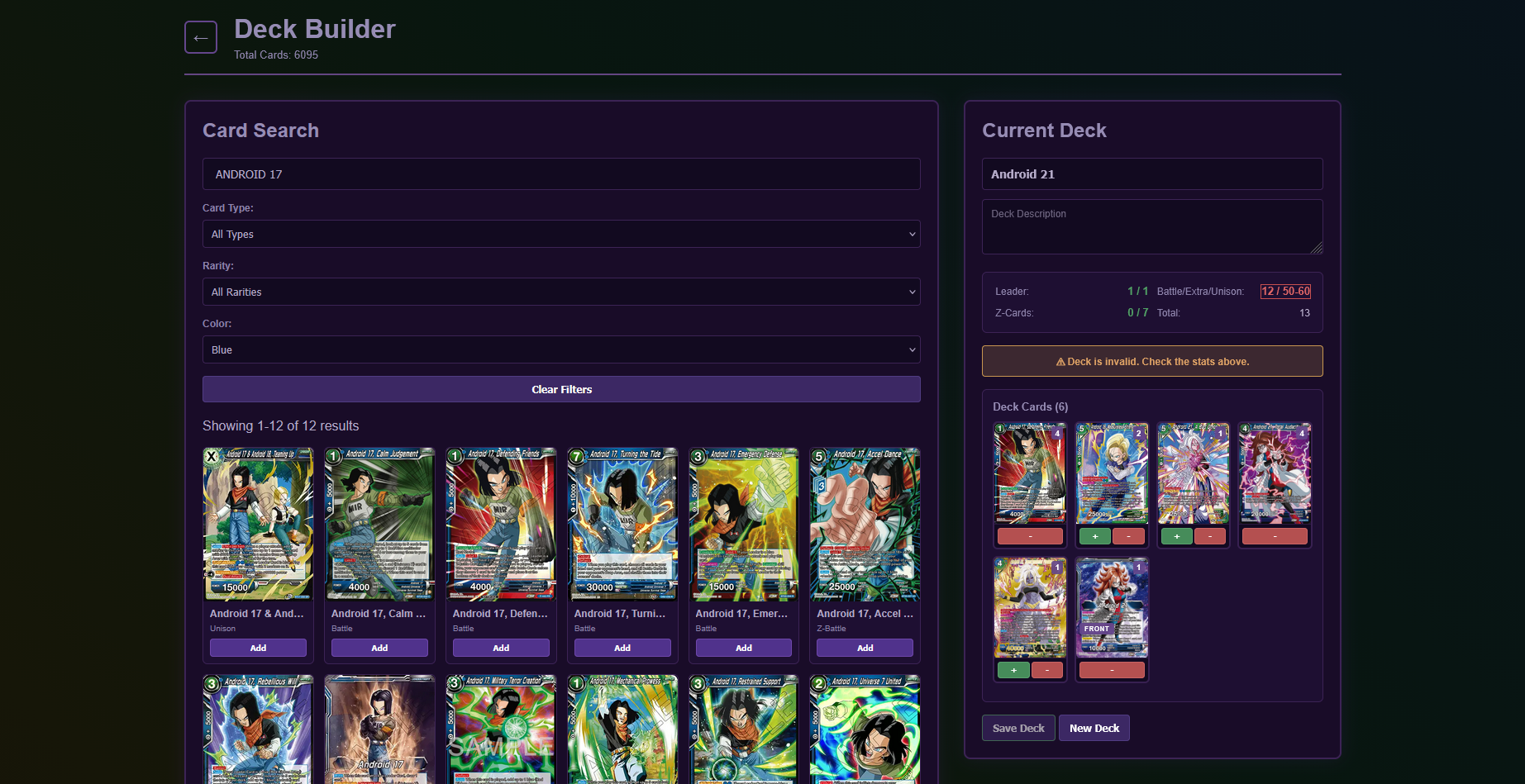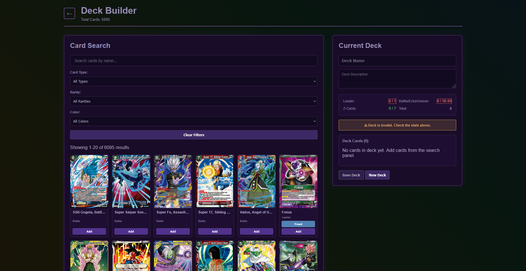 The Dragon Ball Super: Master Unofficial Simulator is a fan made project by me written in Razor, with the goal of fully simulating the complex game actions of the card game for online play. It also allows players to build decks, experiment with them, and share them with the community. This project is ever continuing and improving, if you are interested in viewing it's progress feel free to email me.